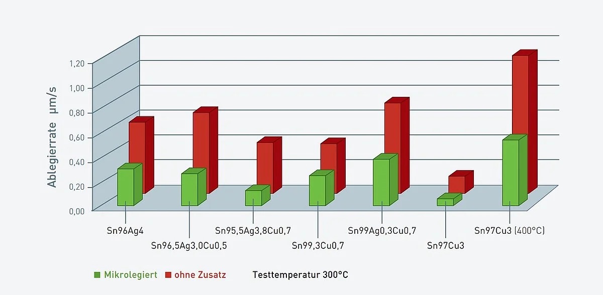 Besonders kostensparend ist die TSC0307-Legierung, die bei 99 Prozent Zinn nur 0,3 Prozent Silber und 0,7 Prozent Kupfer enthält. Hier lassen sich bis zu 90 Prozent des kostentreibenden Edelmetalls Silber einsparen – und das bei nahezu gleichen Verarbeitungseigenschaften.